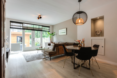 Begane grond: Via de entree aan de achterzijde stap je direct de keuken binnen. De smaakvol afgewerkte woonkamer heeft ramen in de zijgevel, een vaste kast en een speksteen houtkachel dat bekend staat om zijn vermogen om warmte vast te houden. Zelfs nadat het hout is opgebrand, blijft de haard warmte uitstralen, waardoor je extra lang van de gezellige sfeer kunt genieten. Vanuit de keuken heb je leuk zicht op de tuin en via de dubbele tuindeuren stap je zo de zonnige en groene tuin in. Deze keuken beschikt over diverse inbouwapparatuur te weten: inductiekookplaat, afzuigkap, vaatwasser, oven, magnetron, koelkast, heetwaterkraan en een vriezer. Via het tussenhalletje, met toilet kom je op de 1e verdieping.
